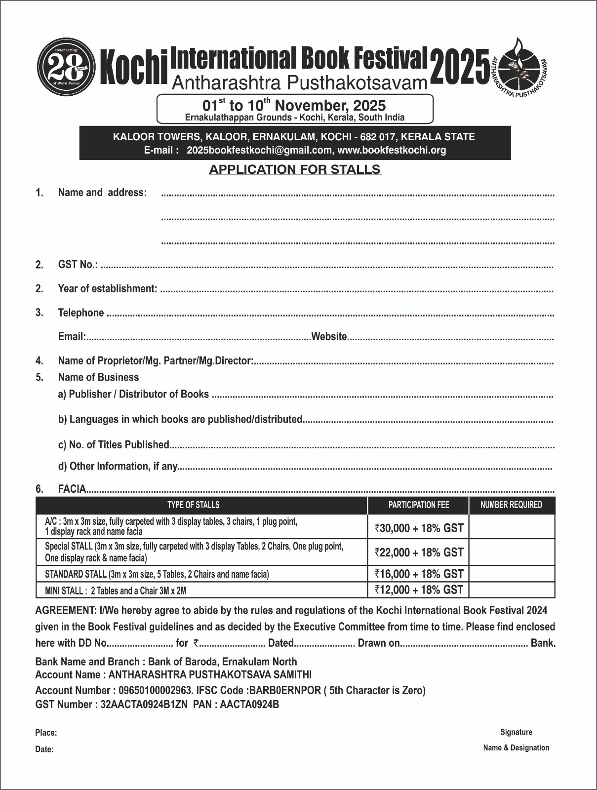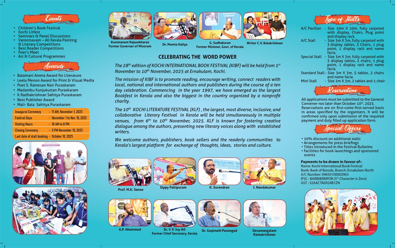 The Kochi International Book Festival celebrates its 28 years of efforts and accomplishments. A spotlight on books and writers around the world, the 28th edition of Bookfest, will be held from November 01_ 10, 2025, at our usual venue, the Ernakulathappan Grounds, Kochi.